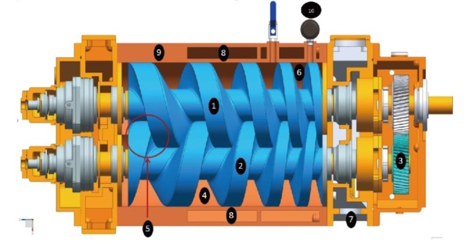 幹式螺杆真空泵的工作過程可分為吸氣、壓縮和排氣三個過程。如圖所示,幹式螺杆真空泵內裝有一對平行的螺旋狀的轉子(1和2),其中一件轉子的旋轉方向為右旋,另一件為左旋。兩個轉子在泵體(9)內通過一對齒輪(3)保持同步反向旋轉。轉子與轉子之間、轉子與泵體之間沒有磨擦且保持一定的間隙,兩個轉子與泵體之間形成了密封腔(4),密封腔的個數等於轉子的螺旋圈數。兩個轉子在按圖中方向旋轉時,與吸氣口(5)相連的密封腔的空間逐漸變大,氣體被吸入並被傳送到排氣側,排氣側的密封腔(6)空間在旋轉過程中逐漸變小,氣體被壓縮到排氣口(7)。長時間運轉時需向泵體及端蓋的夾套(8)內通入適量的冷卻水以對泵進行冷卻。因壓縮熱主要在排氣側(6)產生,為了充分冷卻轉子,在多數工況下可以將適量的空氣或其它合適的氣體通過摻氣口(10)導入泵腔內。